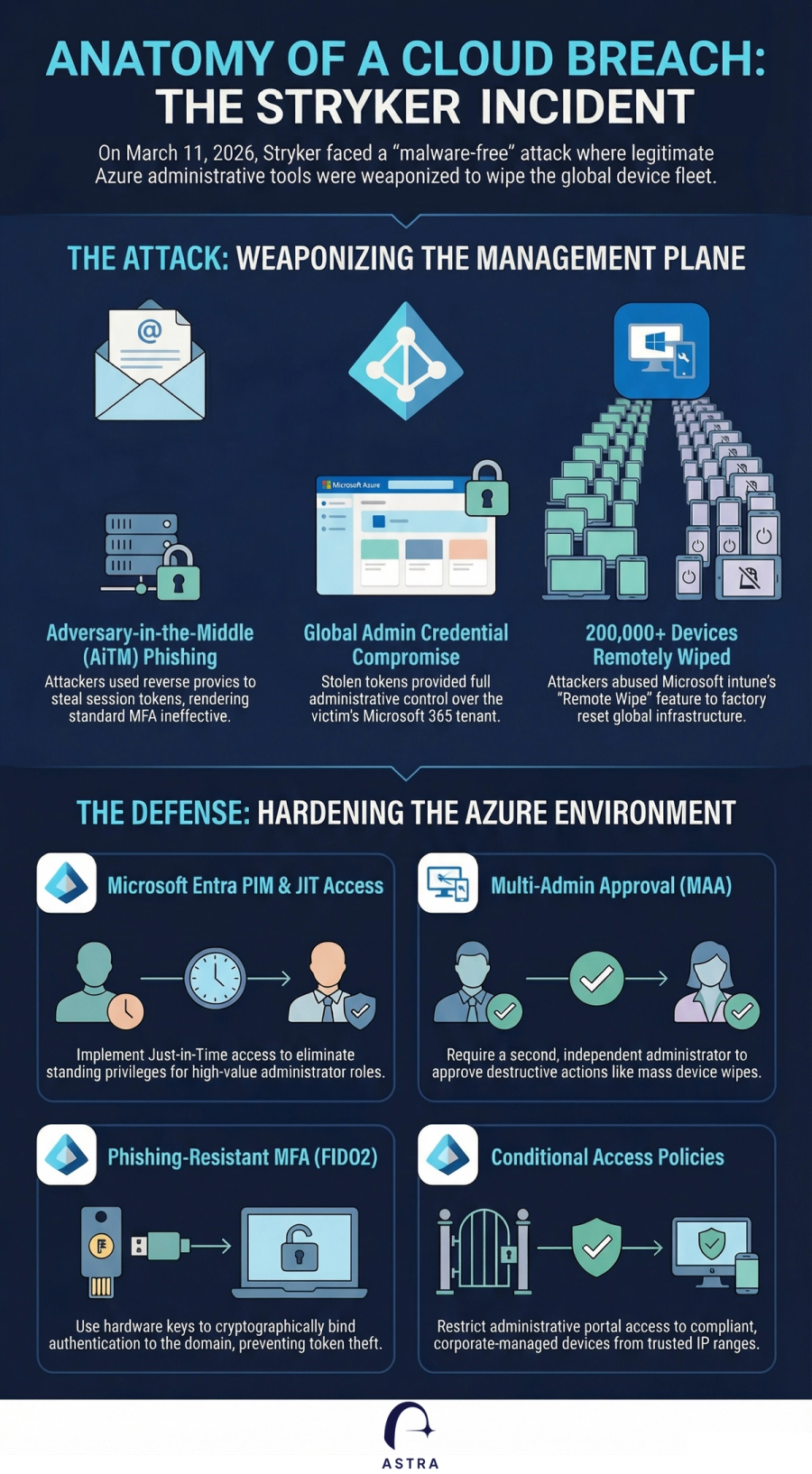 - Weaponization of Microsoft Intune: Attackers gained administrative access to Stryker's Microsoft Intune environment, a cloud-based mobile device management (MDM) platform. They abused the platform's legitimate "remote wipe" capability to issue factory reset commands to approximately 200,000 devices, including servers, laptops, and mobile phones, across 79 countries.