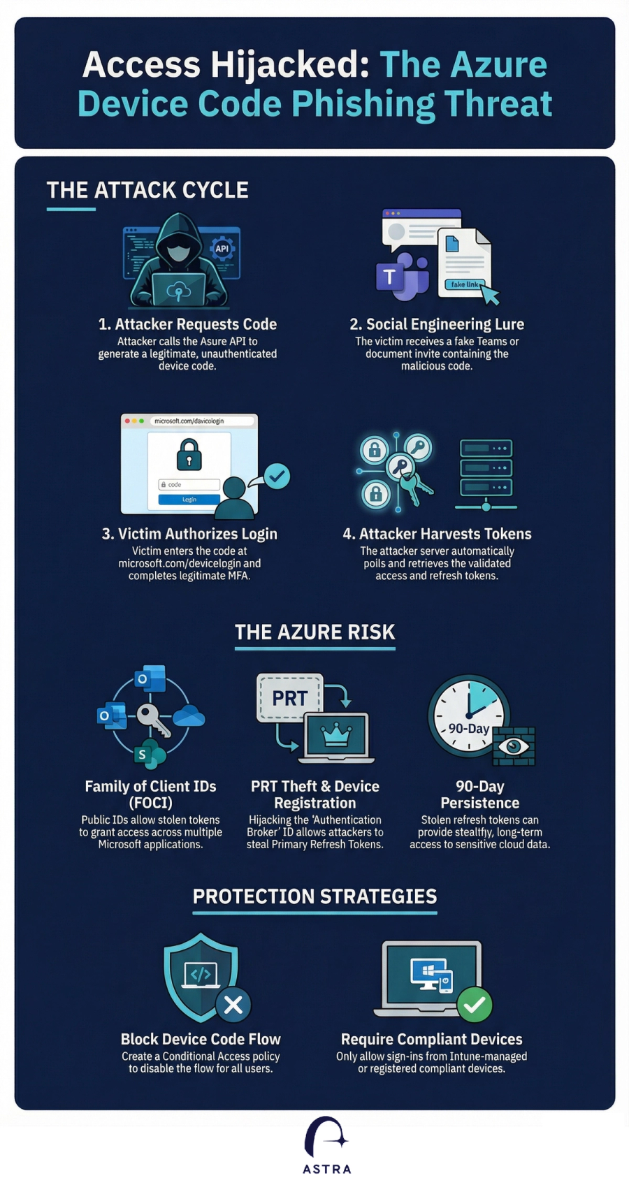 The device code phishing process occurs on legitimate Microsoft infrastructure. As a result, traditional security training that teaches users to check URLs for red flags often fails. Once the user enters the code and completes their MFA challenge, the attacker intercepts the resulting access and refresh tokens giving them long term access to the user's email, teams and other Azure services.
